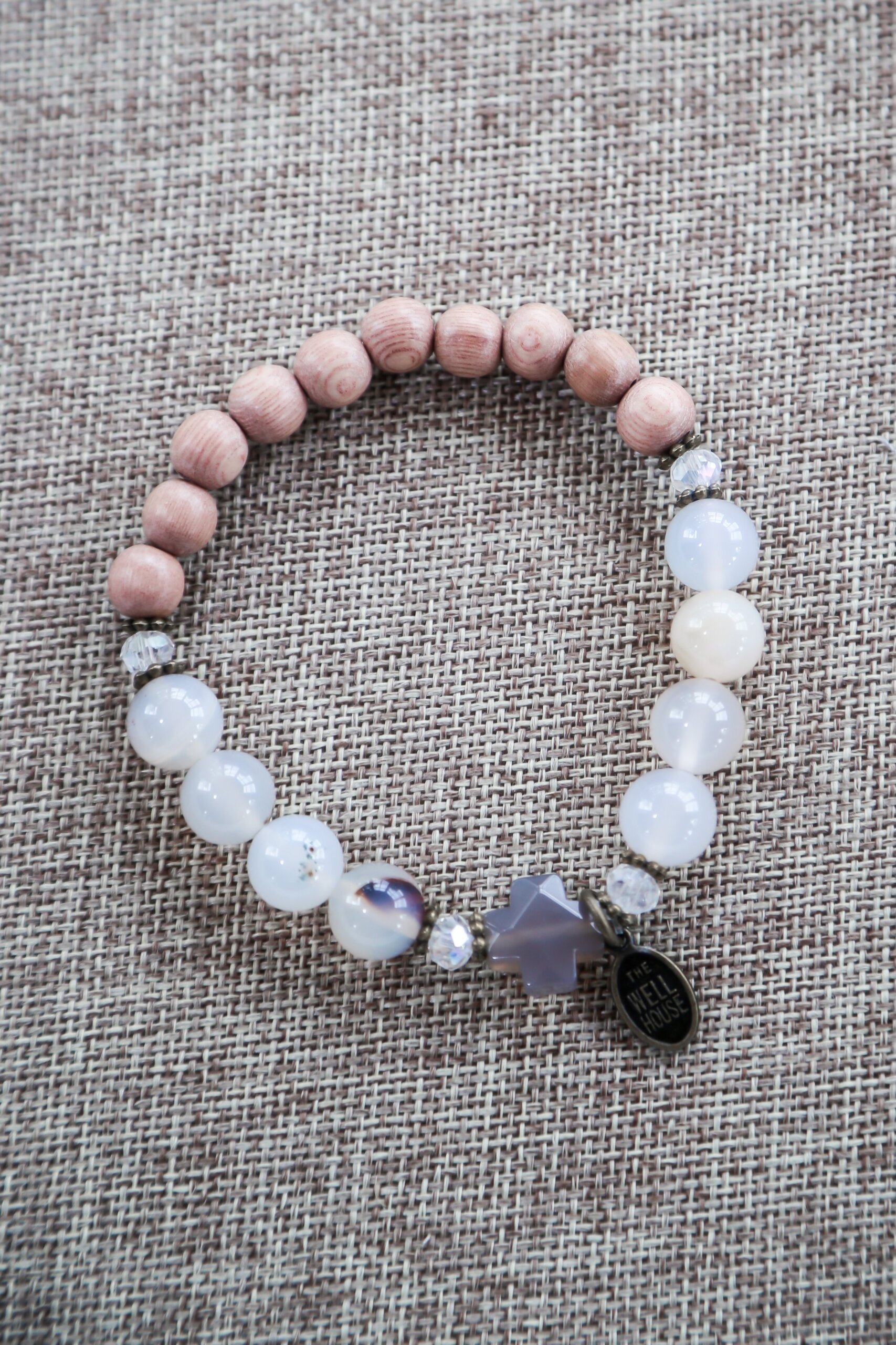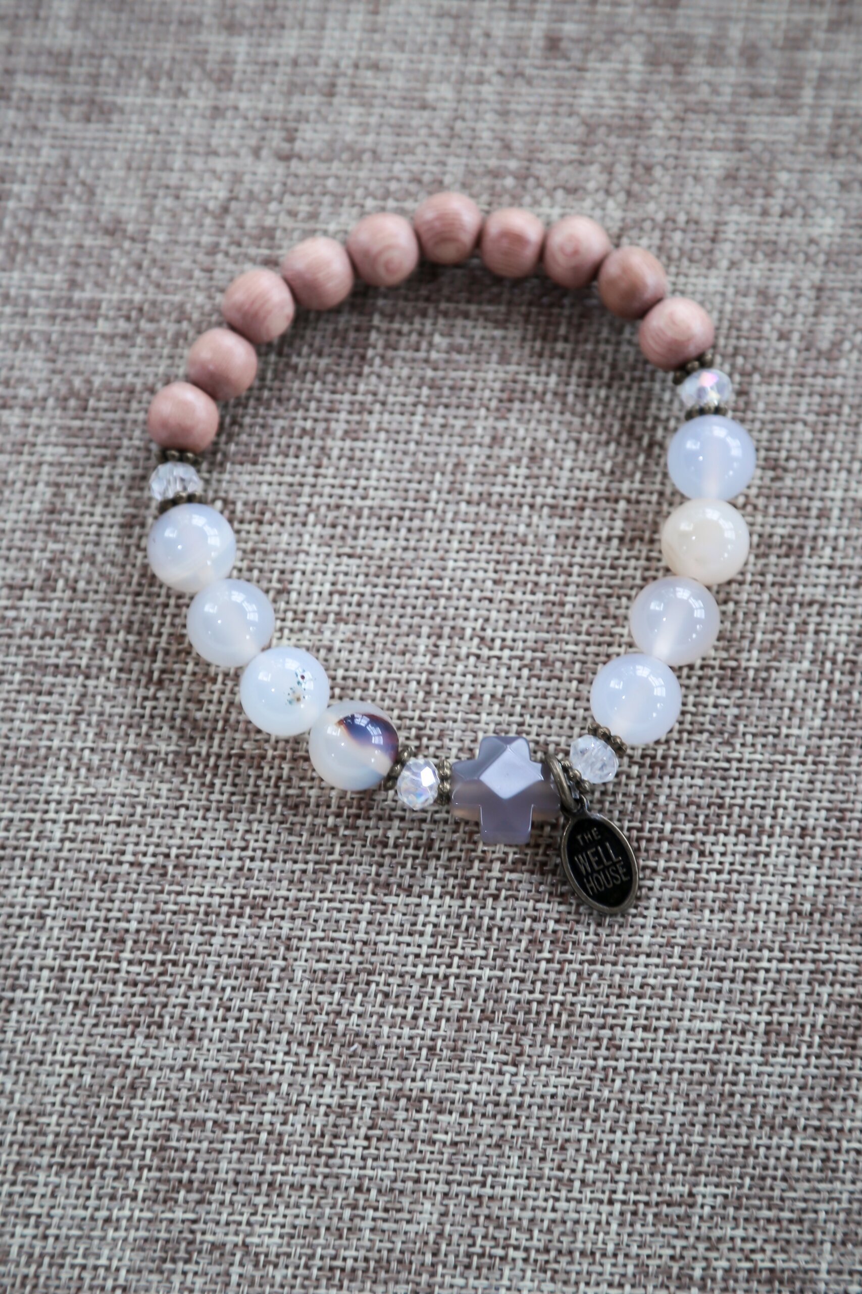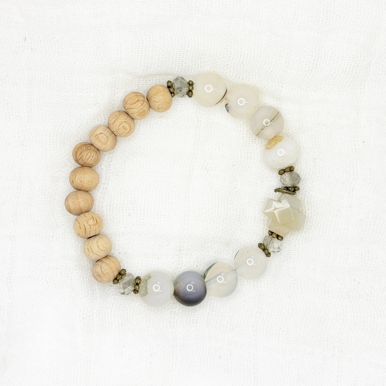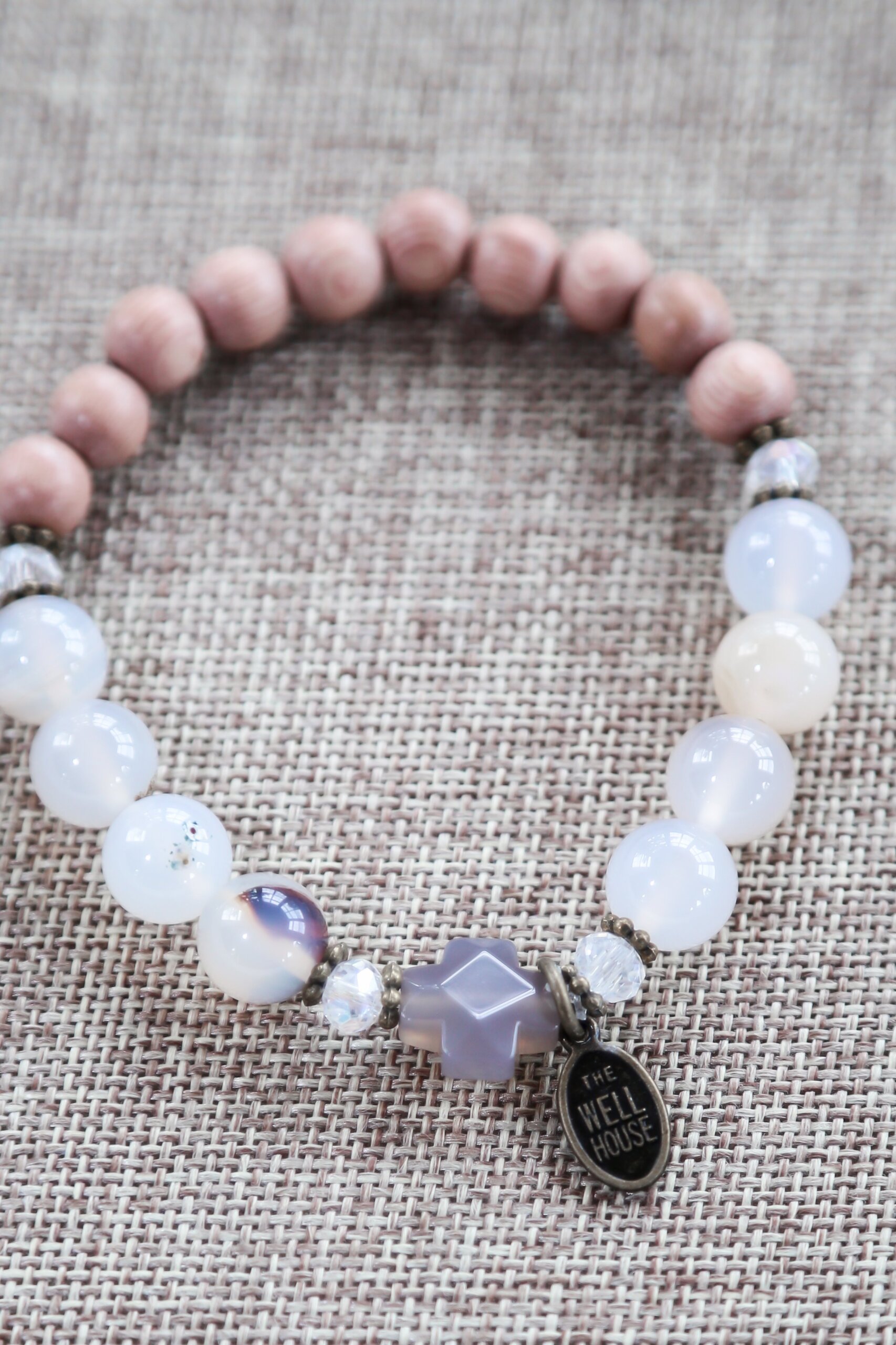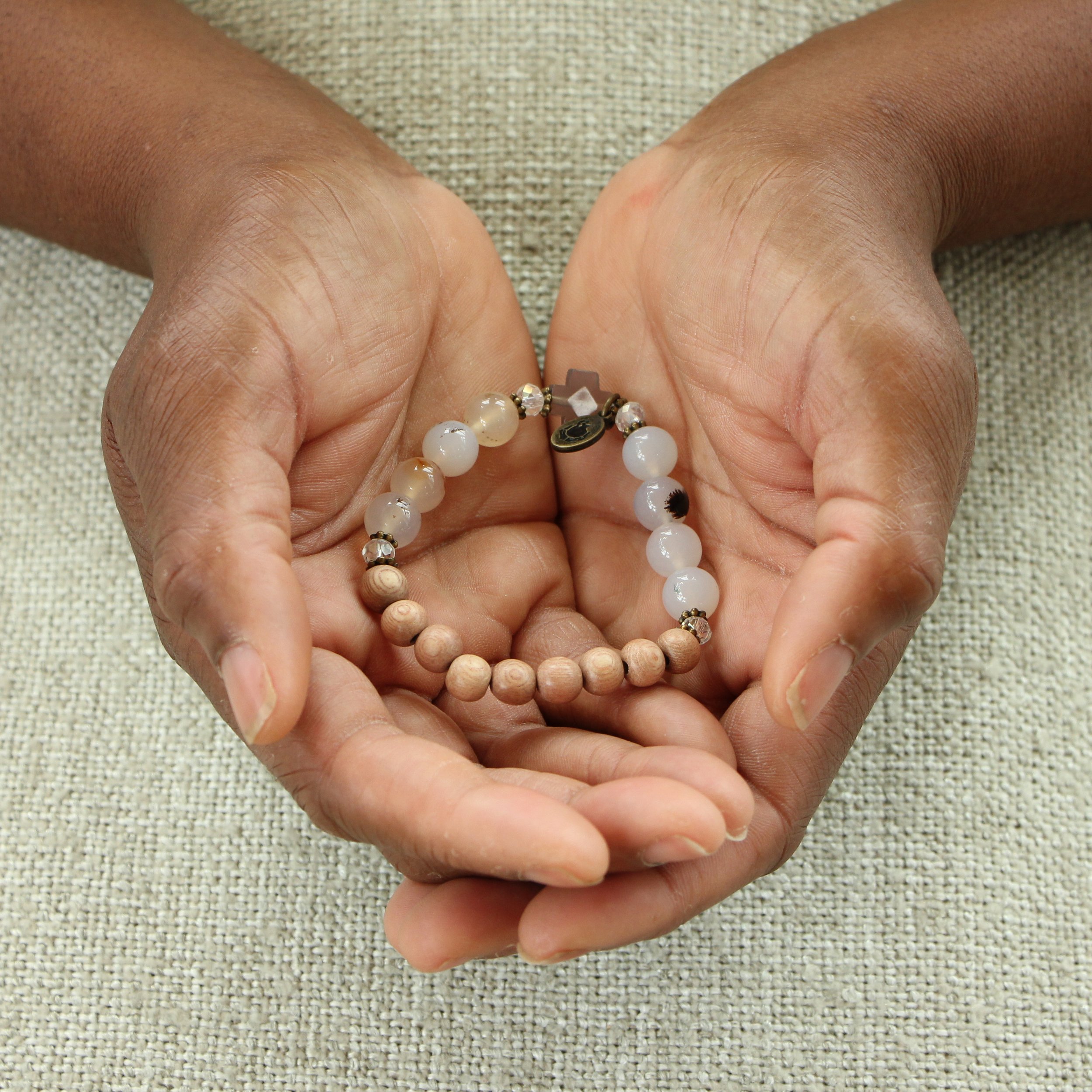 The beautiful Abide bracelet features a grey agate cross, rosewood rosary beads, and natural agate stone. Beautiful as a stand alone or added as a stack with our other designs.