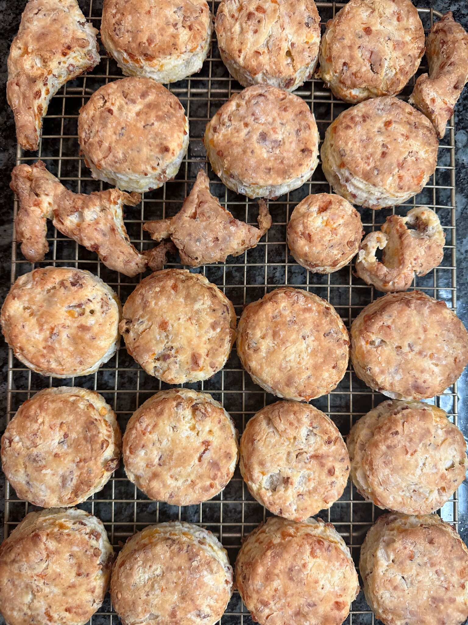 Ingredients: All Purpose Flour, Baking Powder, Kosher Salt, European Butter, Whole Fat Buttermilk, Cheddar Cheese, Maple Syrup, Bacon