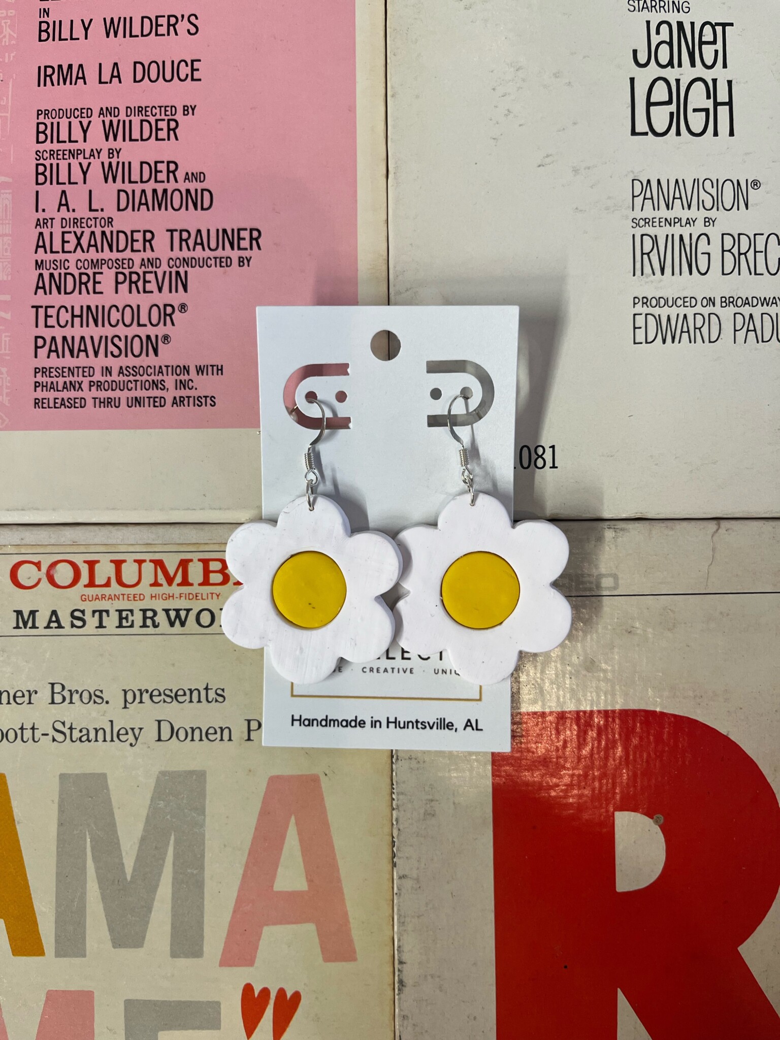 These sweet daisy earrings are made from polymer clay and have silver-plated hardware.