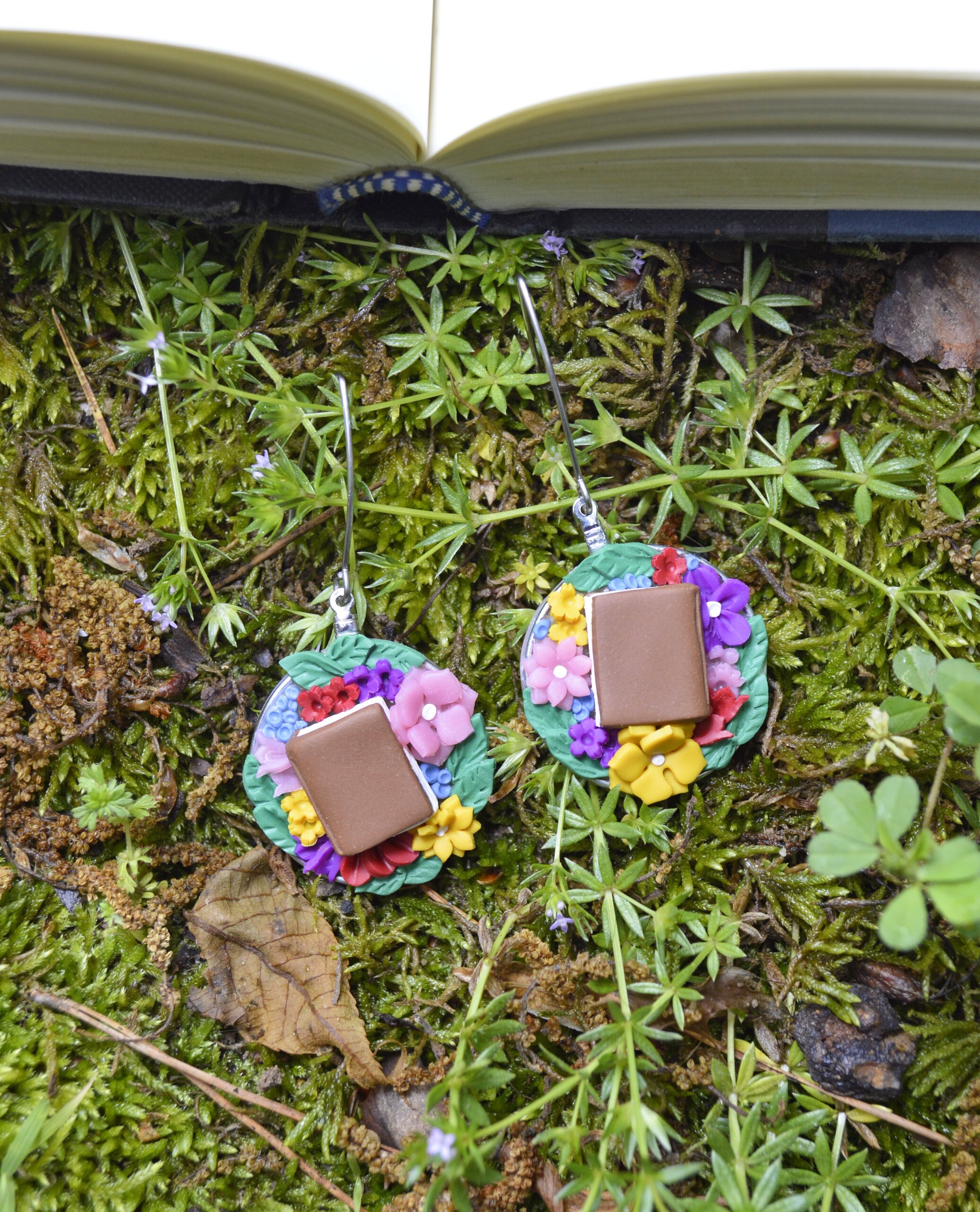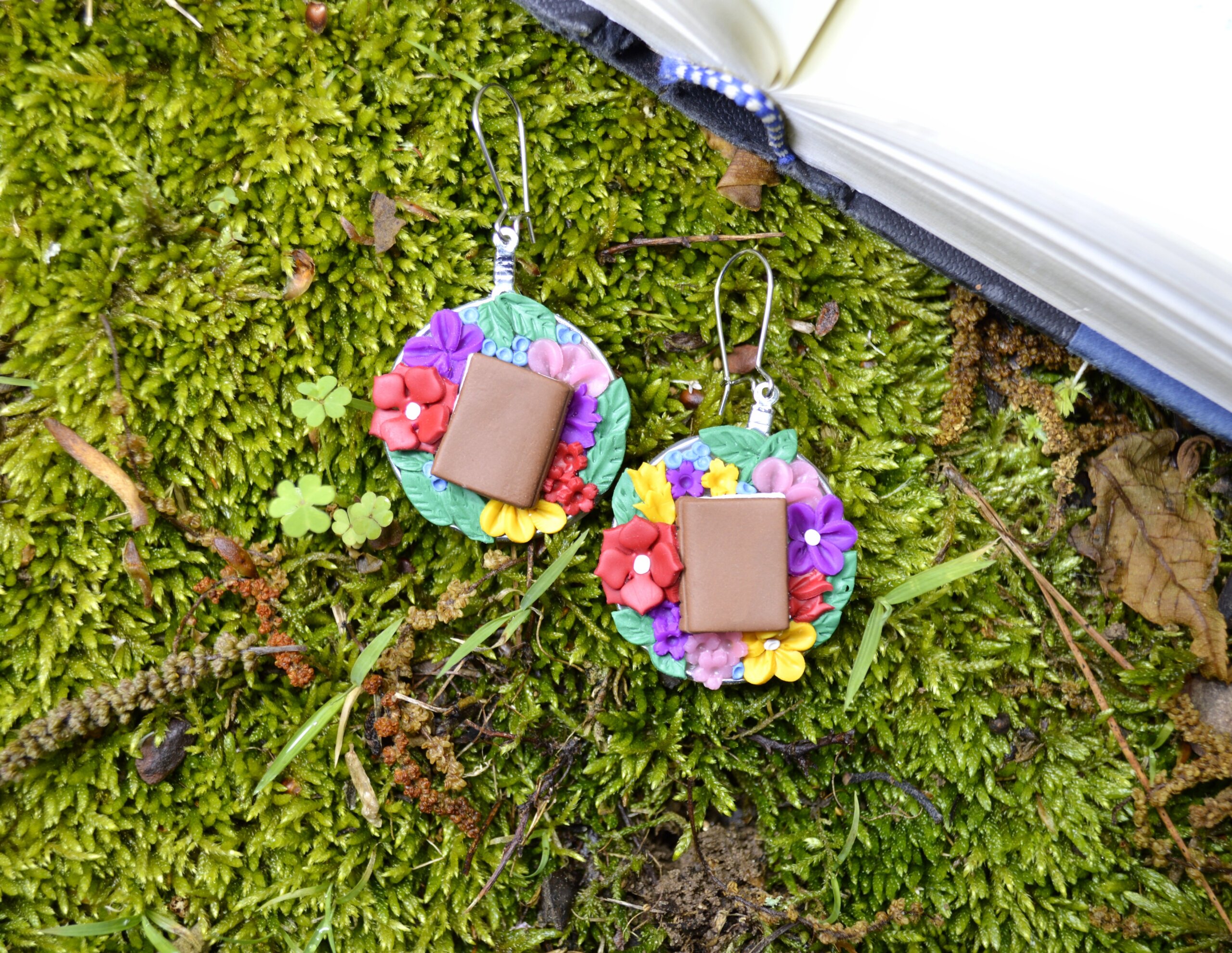 The book is brown with white pages, surrounded by multi-colored floral and greenery! All handmade with clay! The earrings you receive will be similar, not exact to the images shown as they are made to order. These will be made to order – turnaround time is 1-2 weeks.