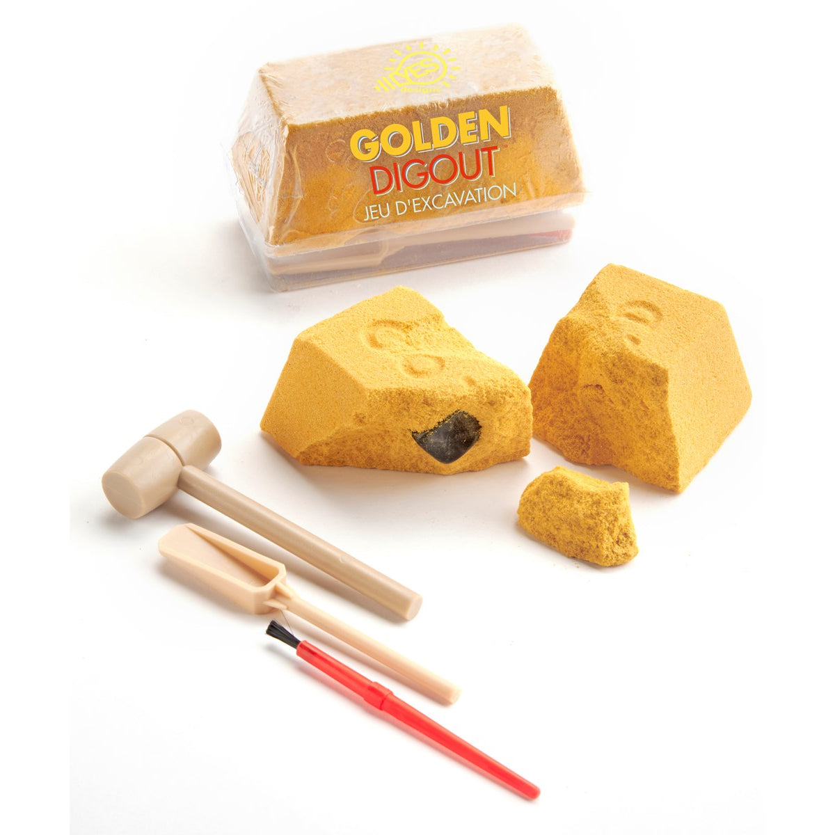 Dig for gemstones or even real gold with this gold brick gem dig out kit complete with chisel, hammer and brush. Available in 6 assorted designs: Obsidian, Red Aventurine, Dalmatian Jasper, Unakite, New Jade, Butter Jade; no telling which one you’ll find! Real gold in 1 of 12 boxes.