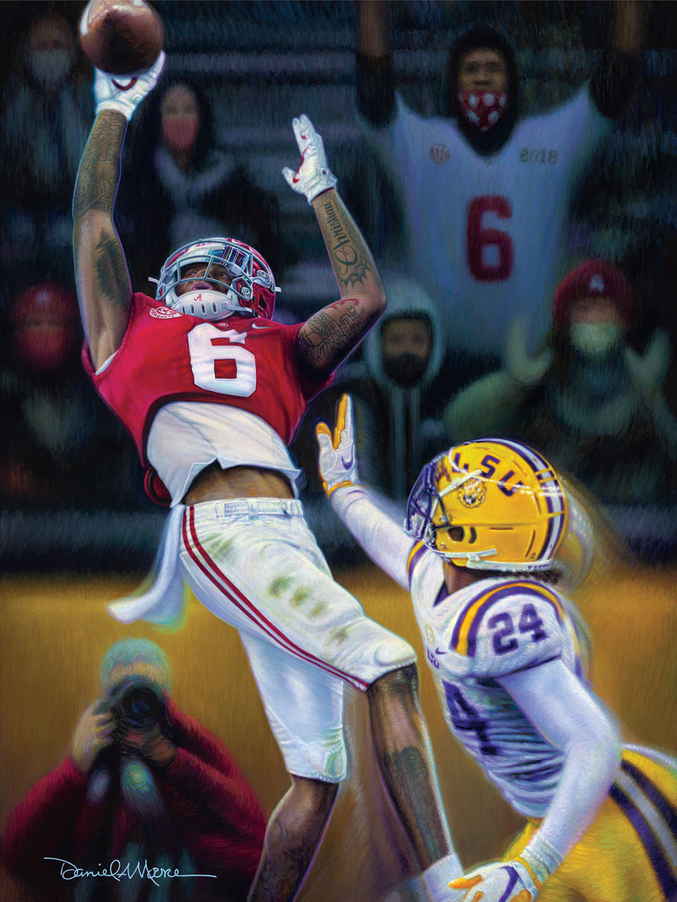 Heisman Heights is Moore’s tribute to Alabama’s DeVonta Smith, the 2020 Heisman Trophy Winner! This original oil painting features Smith’s miraculous one-handed touchdown catch against LSU!