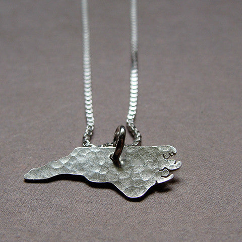 A tiny sterling silver North Carolina charm that is hand cut and hammered and measures 3/4″ by 1/4″ hung on a 16″ sterling silver chain by Oh So ANTSY.