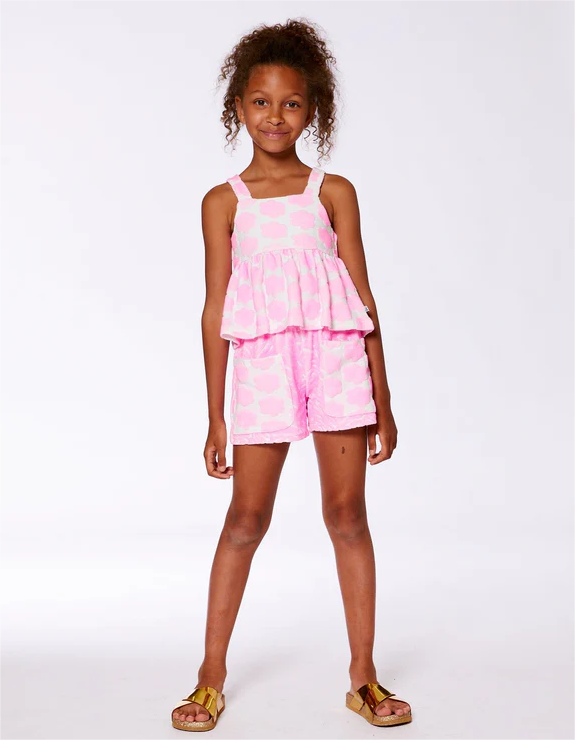 Contrast prints lend bold, vibrant style to our Printed Terry Tank Top and Shorts Set Vibrant Pink and White. In soft towel terry fabric, this set features a sleeveless tank top with a flounce bodice, wide straps, a square neckline, and an allover floral print. We’ve teamed it a comfy elastic waist short with a contrasting allover print and floral print patch pockets on each leg.