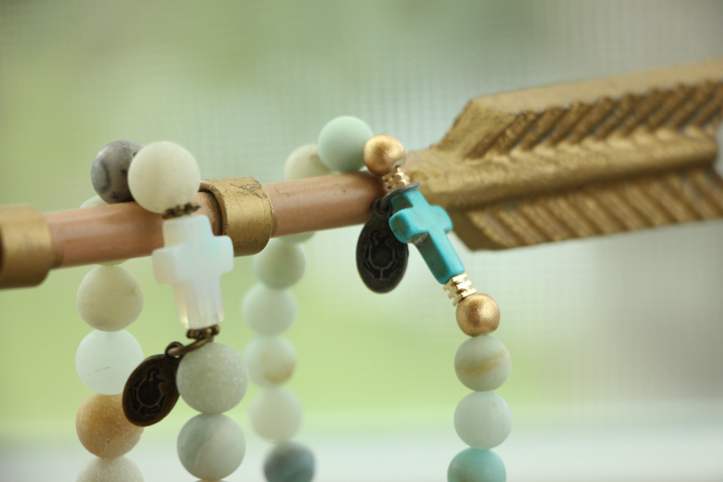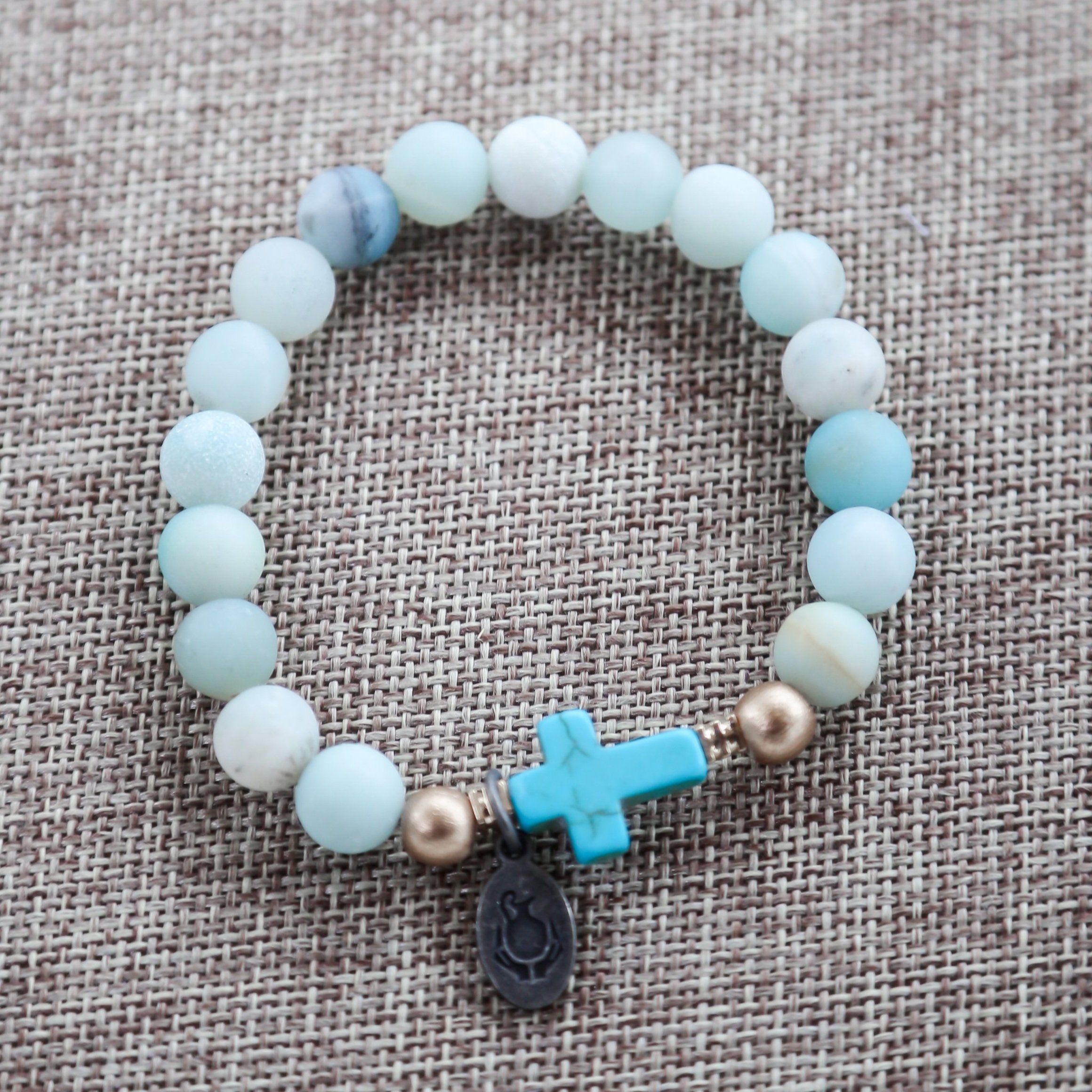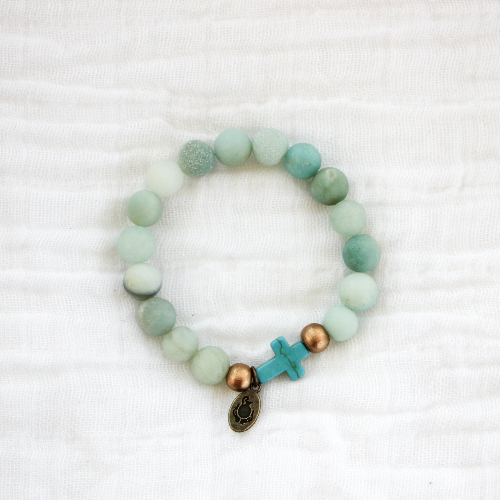 This beautiful bracelet features teal amazonite beads, gold wooden beads and a turquoise cross. Beautiful as a stand alone or added as a stack with our other designs.