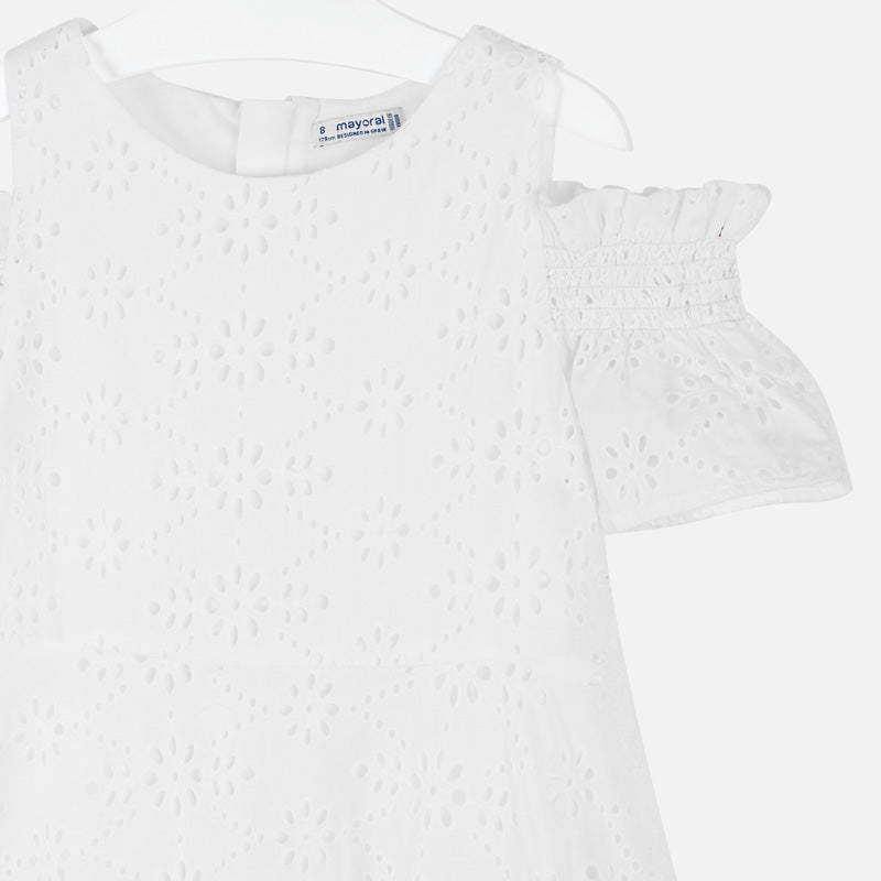 Off the shoulder dress for girl. Round neckline. Opening on the back with an invisible zip. Made from 100% cotton fabric. Decorative elements: openwork details. Sleek design.