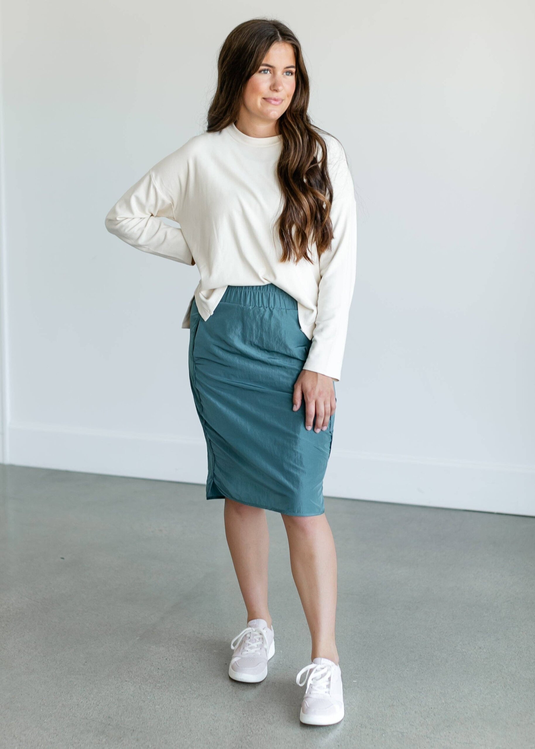 Stay modest and stylish in the Inherit Designed Windy Breaker Midi Skirt. This midi skirt is designed with a wide smocked waistband and high-rise silhouette for a flattering fit. Its split hem allows for great flexibility when engaging in outdoor activities, like walking the dog or hiking. Crafted from breathable fabrics, with built in knee length biker shorts for modest coverage. This skirt is perfect for your next active adventure!