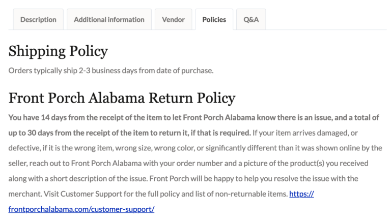 Products purchased are shipped directly from the vendors represented on Front Porch Alabama. You can view each vendor’s shipping policy by clicking on the Policies tab within an individual product description.Â